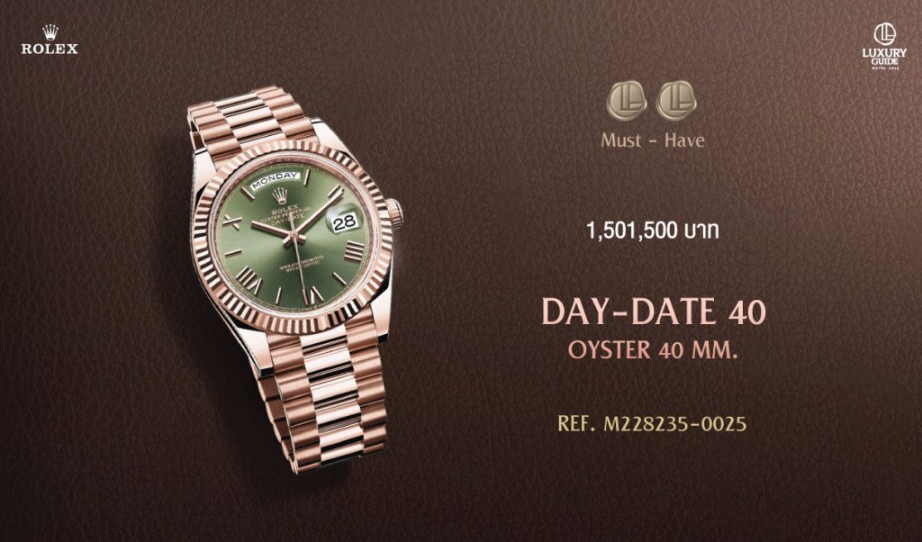 เมื่อนึกถึง Rolex หนึ่งในรุ่นคลาสสิกยอดฮิตคงหนีไม่พ้น Day-Date นาฬิการุ่นแรกของแบรนด์ที่สามารถบอกได้ทั้งวัน และเวลา แต่รุ่นที่เราจะนำมาเสนอในวันนี้ คือ Oyster Perpetual Day-Date 40