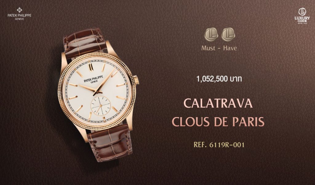 Patek Philippe Calatrava ถือเป็นหนึ่งในตระกูลนาฬิกา Non-sport ดีไซน์คลาสสิกที่โด่งดังที่สุดในโลก โดยจุดเด่นของนาฬิการุ่นนี้คือตัวเรือน โรสโกลด์ 18K ที่มาพร้อมขอบหน้าปัดลายพีระมิด (Clous de Paris) ที่ต้องใช้เทคนิคศิลปะขั้นสูงอย่าง ‘กิโยเช่’ (ใช้ความละเอียดขั้นสูง แกะสลักด้วยมือเท่านั้น) ในการทำ เข้ากับสายหนังสีน้ำตาลเป็นอย่างดี